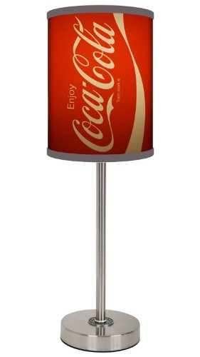 Coca-Cola Coke can Table, The ultimate lamp for the Coca-Cola collector: The iconic Coca-Cola Can lamp! Officially licensed. The cylindrical shade sits atop a sleek brushed nickel base. Each lamp is sent in a re-shippable box with a carry handle and includes a 13W energy-saving bulb. Lamp measures 21" high, shade is 7" in diameter and cord length is 80". Uses up to 75 watt bulb and the on/off switch is at base of socket. Dust with a dry cloth. UL listed.